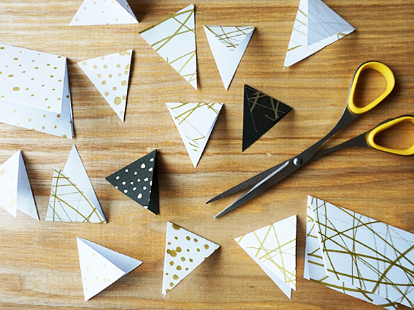 手間を省くため、紙を折って、まとめて三角にカットします。