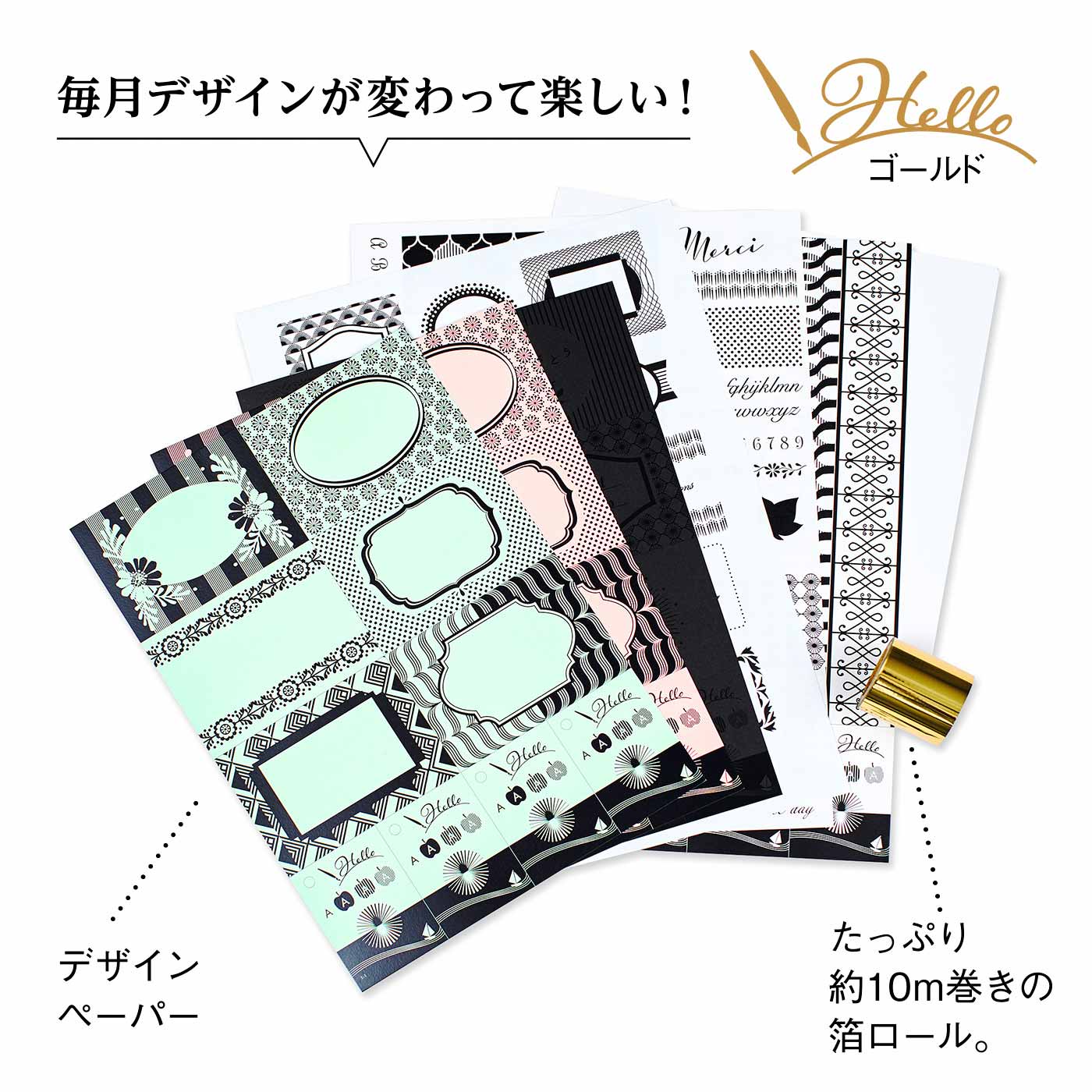 こちらのキット、月1でラベル・タグ等の台紙とロール状の箔がセットで届くというもの。